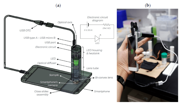 La reacción es determinada por medio de la cámara del teléfono y accesorio periférico diseñado por los investigadores que incluye un LED, un difusor óptico que ayuda a homogenizar espacialmente la intensidad de la luz LED, elementos adicionales son descritos en el accesorio creado, como una lente biconvexa fija que permite acortar la distancia focal de la cámara a la muestra a analizar, entre otros. La muestra y el reactivo son mezclados en partes iguales y ubicada en portaobjetos y cubierta por un cubreobjetos evitando la formación de burbujas de aire, el cual es colocado entre el accesorio y la cámara del teléfono. Se uso un teléfono celular con unas características generales de un equipo de gama media – alta del mercado.