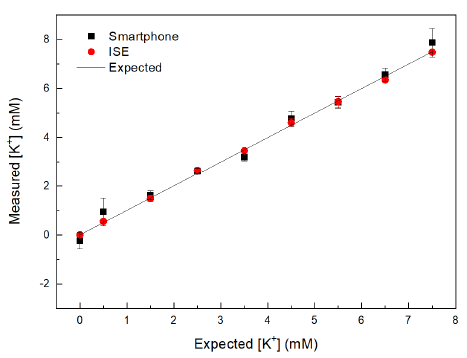 La técnica fue validada frente a instrumentos de análisis de las dos metodologías principales, ISE y AAS. Usaron 6 muestras con concentraciones que van desde 0.5 – 7.5 mmol/L. Por encima de 1,5 mmol/L la precisión estaba dentro de 0,27 mmol/L y la exactitud de la lectura estaba dentro de 0,18 mmol/L. Se hicieron pruebas de selectividad de la prueba al usar compuestos como el NaCl y KCl y con diversos ensayos demostraron que el la presencia de Na+ no afecta la medición de K+.